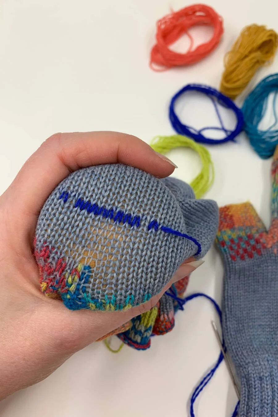 Using a darning mushroom can help for projects that are otherwise difficult to hold- like socks or gloves, and sometimes just for any fine knit fabric.