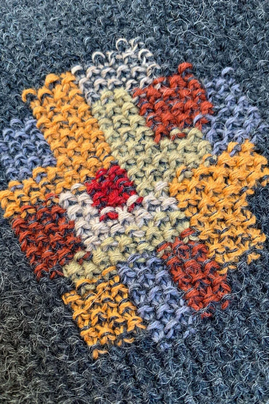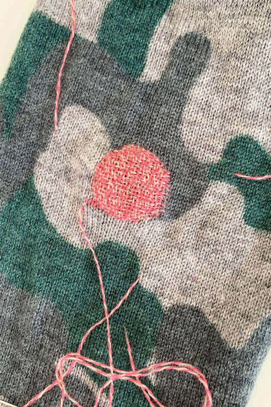 The next type of darning is swiss darning, also known as duplicate stitch. It’s not at all similar to darning, as it’s a knitwear specific mending technique and mimics the knitted fabric.