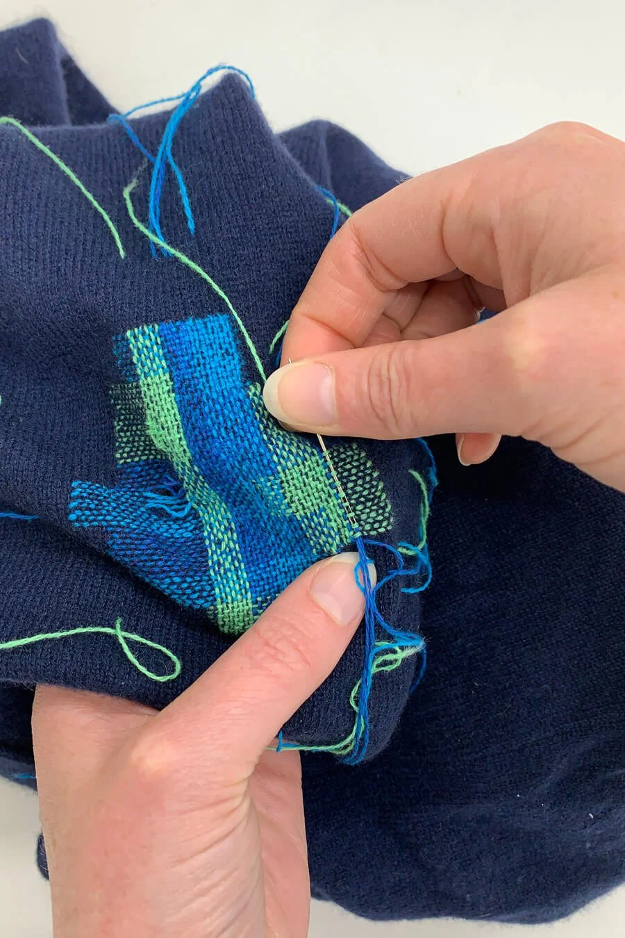 Darning is a great type of mending stitch, and I highly recommend playing around with it to find effects you like. It’s great for blending colours, and for creating tartan and tweedy effects within your mends, as well as ginghams and check patterns. As well as step by step instruction for darning itsself, I also include a chapter on darning patterns in my book ‘Visible Creative Mending for Knitwear”.