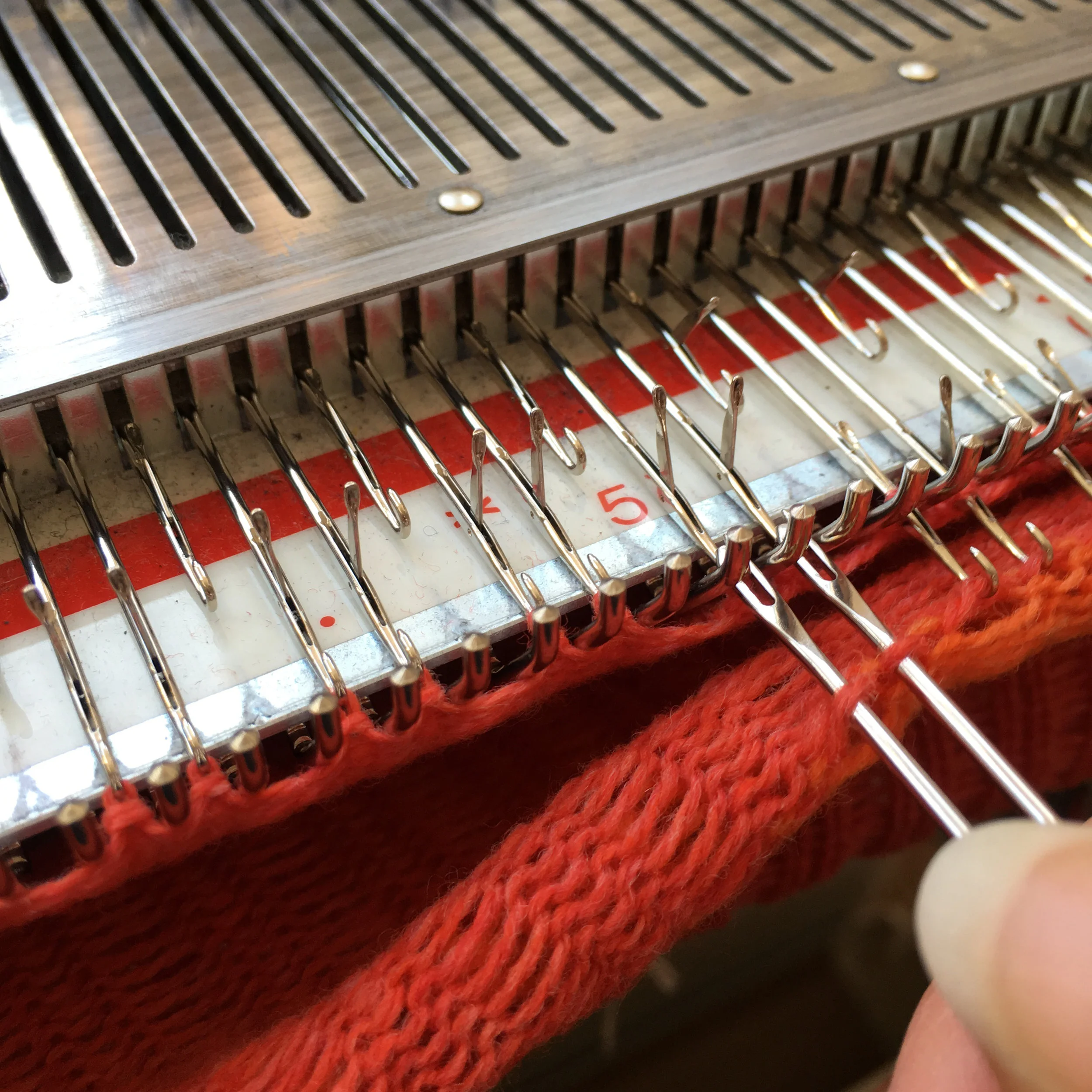 For these lambswool hats, I use a domestic knitting machine. It's a bit different from my V-bed- it knits a heavier weight of fabric, and can knit different types of patterns. It's still a very hands-on process- I cast on each stitch, move the knitting machine carriage across for each row, and have to transfer stitches using the transfer tools you see in the photos. It requires precision!