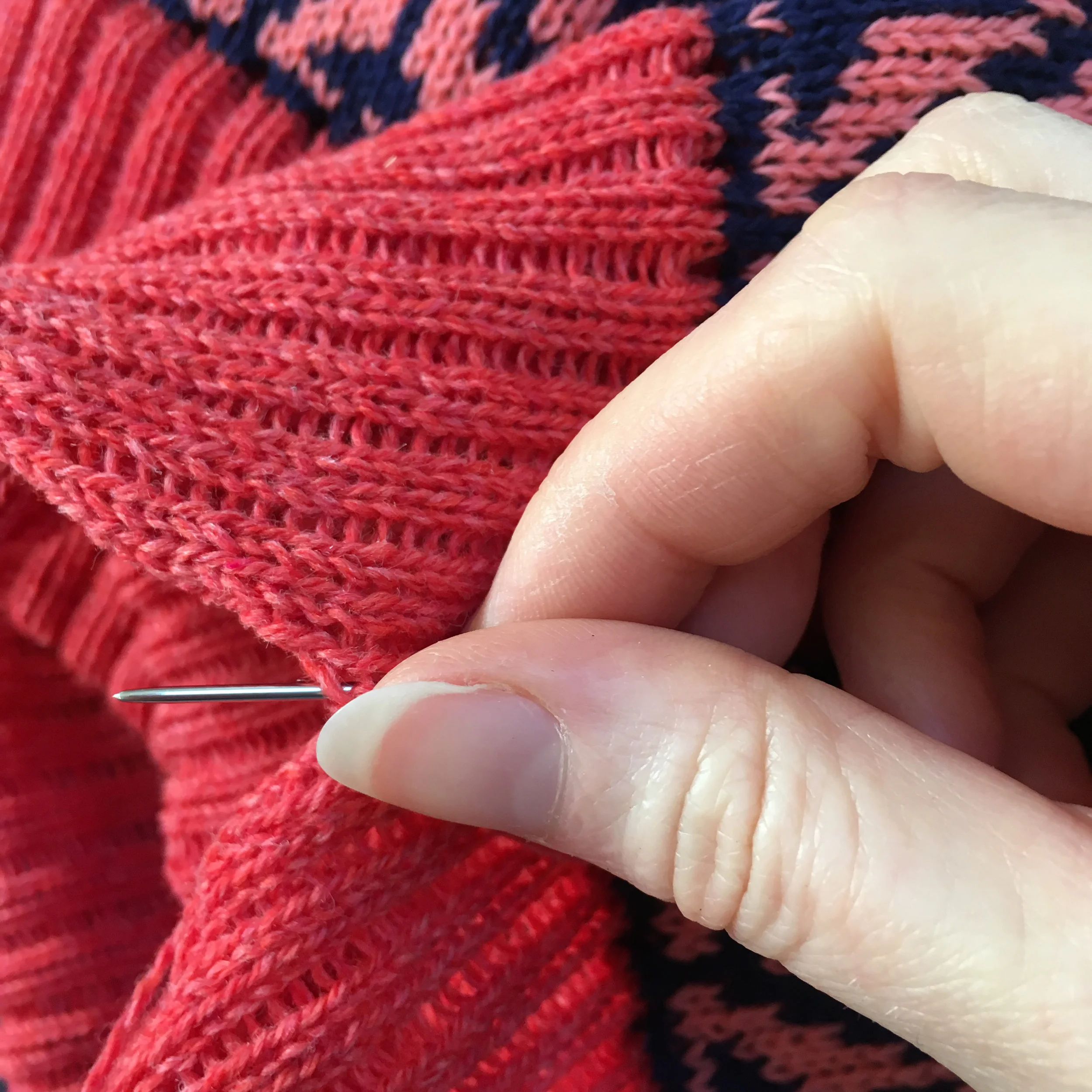 Transferring stitches by hand.