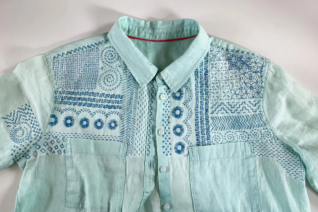The finished visibly mended linen shirt, with sashiko inspired stitching and intuitive design